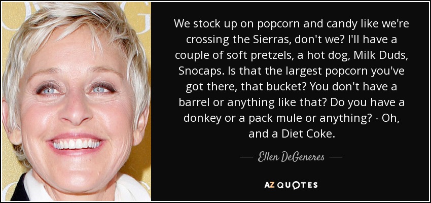 We stock up on popcorn and candy like we're crossing the Sierras, don't we? I'll have a couple of soft pretzels, a hot dog, Milk Duds, Snocaps. Is that the largest popcorn you've got there, that bucket? You don't have a barrel or anything like that? Do you have a donkey or a pack mule or anything? - Oh, and a Diet Coke.
