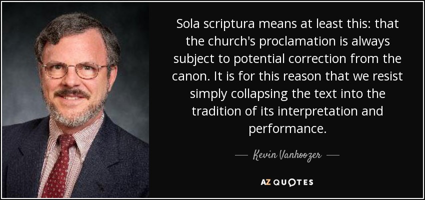 Sola scriptura means at least this: that the church's proclamation is always subject to potential correction from the canon. It is for this reason that we resist simply collapsing the text into the tradition of its interpretation and performance.