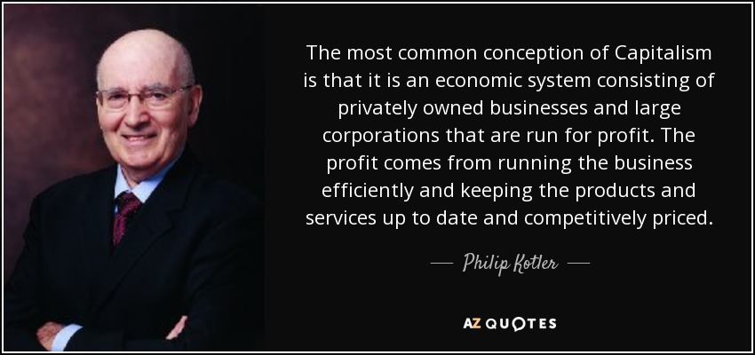 The most common conception of Capitalism is that it is an economic system consisting of privately owned businesses and large corporations that are run for profit. The profit comes from running the business efficiently and keeping the products and services up to date and competitively priced.