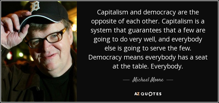 Capitalism and democracy are the opposite of each other. Capitalism is a system that guarantees that a few are going to do very well, and everybody else is going to serve the few. Democracy means everybody has a seat at the table. Everybody.