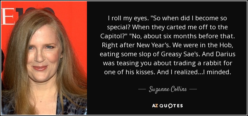 I roll my eyes. "So when did I become so special? When they carted me off to the Capitol?" "No, about six months before that. Right after New Year's. We were in the Hob, eating some slop of Greasy Sae's. And Darius was teasing you about trading a rabbit for one of his kisses. And I realized...I minded.