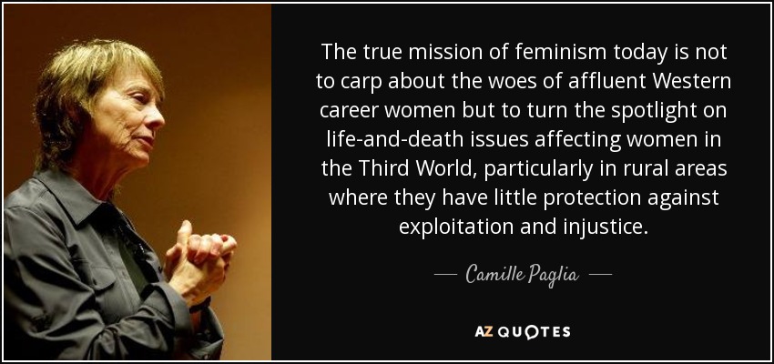 The true mission of feminism today is not to carp about the woes of affluent Western career women but to turn the spotlight on life-and-death issues affecting women in the Third World, particularly in rural areas where they have little protection against exploitation and injustice.