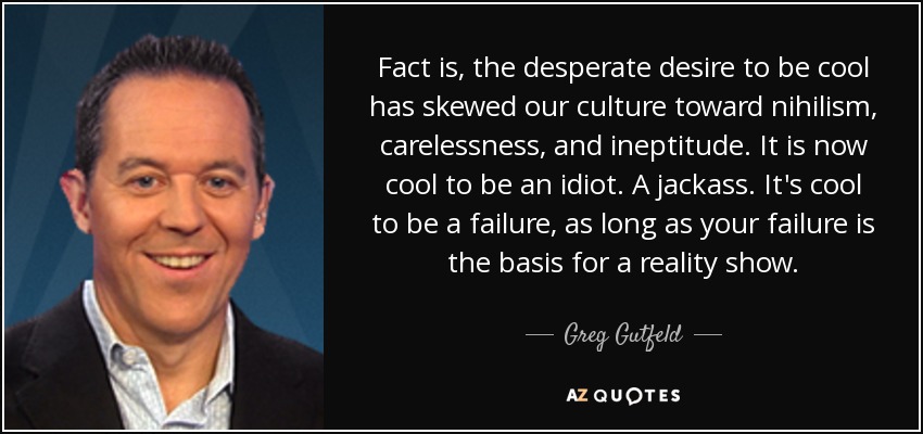 Fact is, the desperate desire to be cool has skewed our culture toward nihilism, carelessness, and ineptitude. It is now cool to be an idiot. A jackass. It's cool to be a failure, as long as your failure is the basis for a reality show.