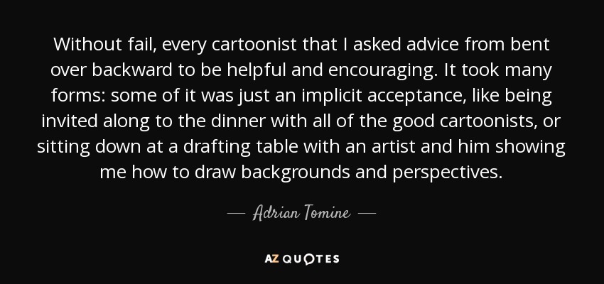 Without fail, every cartoonist that I asked advice from bent over backward to be helpful and encouraging. It took many forms: some of it was just an implicit acceptance, like being invited along to the dinner with all of the good cartoonists, or sitting down at a drafting table with an artist and him showing me how to draw backgrounds and perspectives.