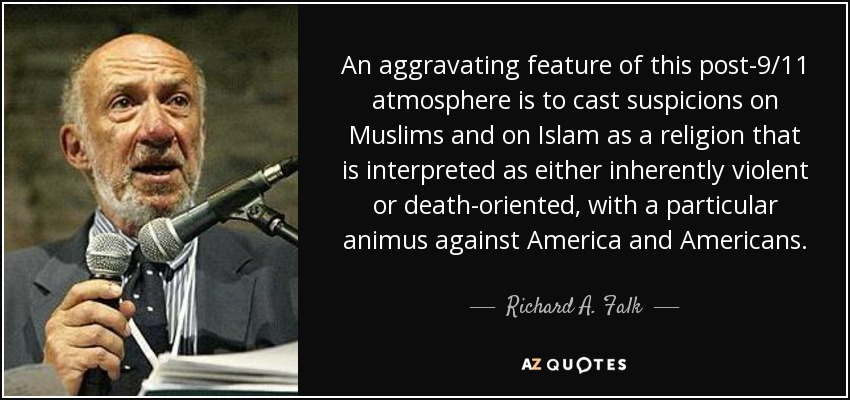 An aggravating feature of this post-9/11 atmosphere is to cast suspicions on Muslims and on Islam as a religion that is interpreted as either inherently violent or death-oriented, with a particular animus against America and Americans.