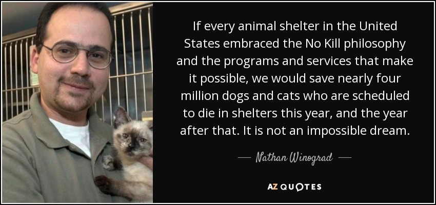 If every animal shelter in the United States embraced the No Kill philosophy and the programs and services that make it possible, we would save nearly four million dogs and cats who are scheduled to die in shelters this year, and the year after that. It is not an impossible dream.