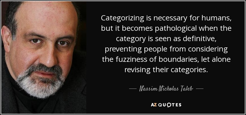 Categorizing is necessary for humans, but it becomes pathological when the category is seen as definitive, preventing people from considering the fuzziness of boundaries, let alone revising their categories.