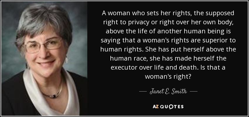 A woman who sets her rights, the supposed right to privacy or right over her own body, above the life of another human being is saying that a woman's rights are superior to human rights. She has put herself above the human race, she has made herself the executor over life and death. Is that a woman's right?