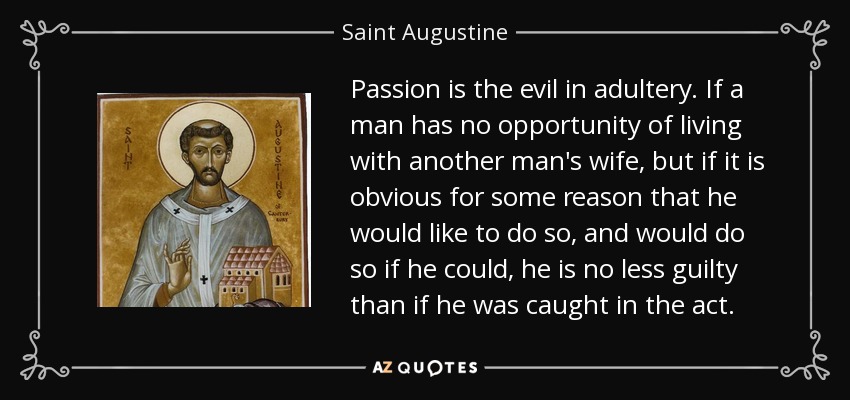 Passion is the evil in adultery. If a man has no opportunity of living with another man's wife, but if it is obvious for some reason that he would like to do so, and would do so if he could, he is no less guilty than if he was caught in the act.
