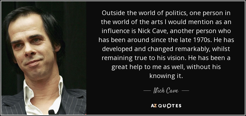Outside the world of politics, one person in the world of the arts I would mention as an influence is Nick Cave, another person who has been around since the late 1970s. He has developed and changed remarkably, whilst remaining true to his vision. He has been a great help to me as well, without his knowing it.