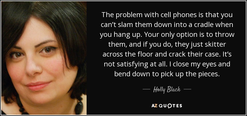 The problem with cell phones is that you can’t slam them down into a cradle when you hang up. Your only option is to throw them, and if you do, they just skitter across the floor and crack their case. It’s not satisfying at all. I close my eyes and bend down to pick up the pieces.