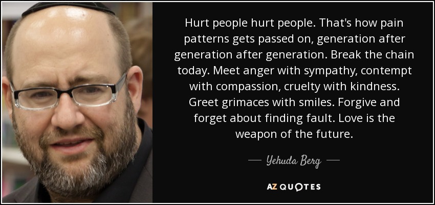 Hurt people hurt people. That's how pain patterns gets passed on, generation after generation after generation. Break the chain today. Meet anger with sympathy, contempt with compassion, cruelty with kindness. Greet grimaces with smiles. Forgive and forget about finding fault. Love is the weapon of the future.