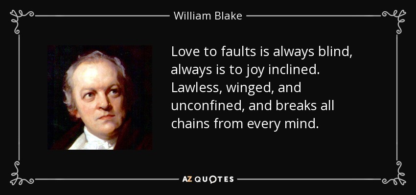 Love to faults is always blind, always is to joy inclined. Lawless, winged, and unconfined, and breaks all chains from every mind.