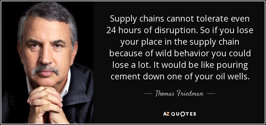 Supply chains cannot tolerate even 24 hours of disruption. So if you lose your place in the supply chain because of wild behavior you could lose a lot. It would be like pouring cement down one of your oil wells.