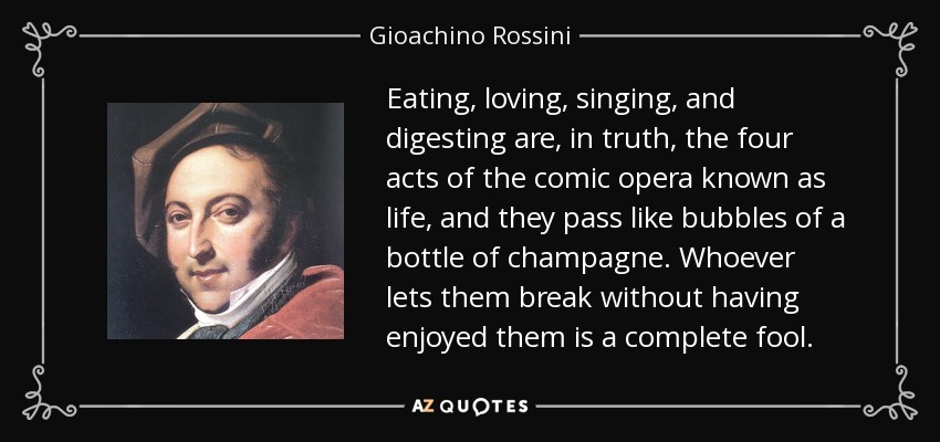 Eating, loving, singing, and digesting are, in truth, the four acts of the comic opera known as life, and they pass like bubbles of a bottle of champagne. Whoever lets them break without having enjoyed them is a complete fool.