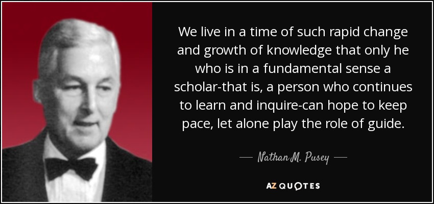 We live in a time of such rapid change and growth of knowledge that only he who is in a fundamental sense a scholar-that is, a person who continues to learn and inquire-can hope to keep pace, let alone play the role of guide.