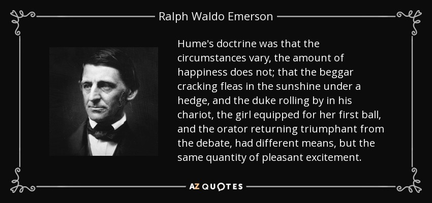 Hume's doctrine was that the circumstances vary, the amount of happiness does not; that the beggar cracking fleas in the sunshine under a hedge, and the duke rolling by in his chariot, the girl equipped for her first ball, and the orator returning triumphant from the debate, had different means, but the same quantity of pleasant excitement.