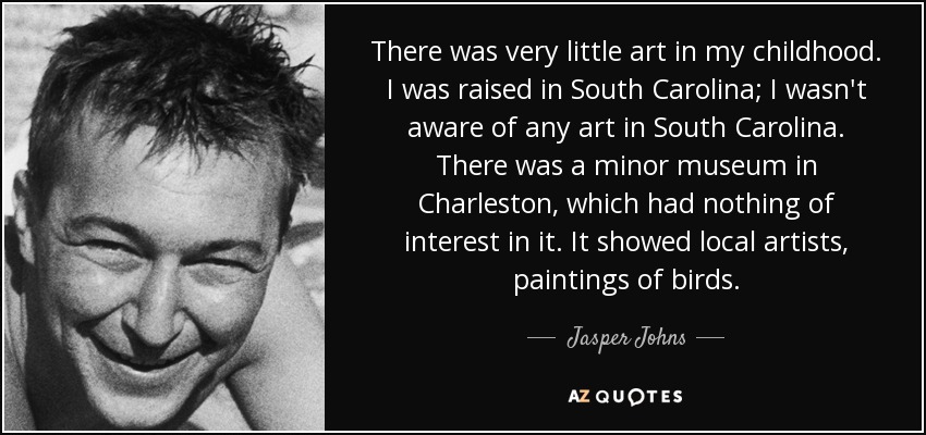 There was very little art in my childhood. I was raised in South Carolina; I wasn't aware of any art in South Carolina. There was a minor museum in Charleston, which had nothing of interest in it. It showed local artists, paintings of birds.