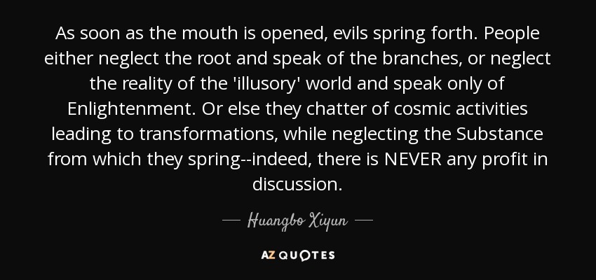 As soon as the mouth is opened, evils spring forth. People either neglect the root and speak of the branches, or neglect the reality of the 'illusory' world and speak only of Enlightenment. Or else they chatter of cosmic activities leading to transformations, while neglecting the Substance from which they spring--indeed, there is NEVER any profit in discussion.