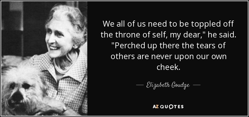We all of us need to be toppled off the throne of self, my dear," he said. "Perched up there the tears of others are never upon our own cheek.