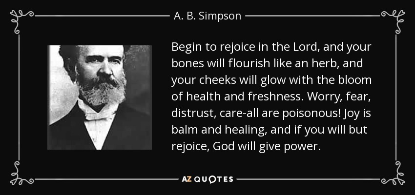 Begin to rejoice in the Lord, and your bones will flourish like an herb, and your cheeks will glow with the bloom of health and freshness. Worry, fear, distrust, care-all are poisonous! Joy is balm and healing, and if you will but rejoice, God will give power.
