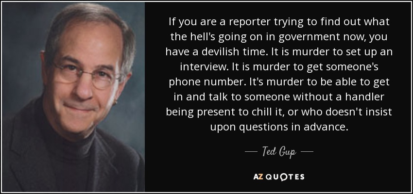 If you are a reporter trying to find out what the hell's going on in government now, you have a devilish time. It is murder to set up an interview. It is murder to get someone's phone number. It's murder to be able to get in and talk to someone without a handler being present to chill it, or who doesn't insist upon questions in advance.