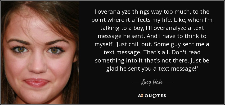 I overanalyze things way too much, to the point where it affects my life. Like, when I'm talking to a boy, I'll overanalyze a text message he sent. And I have to think to myself, 'Just chill out. Some guy sent me a text message. That's all. Don't read something into it that's not there. Just be glad he sent you a text message!'
