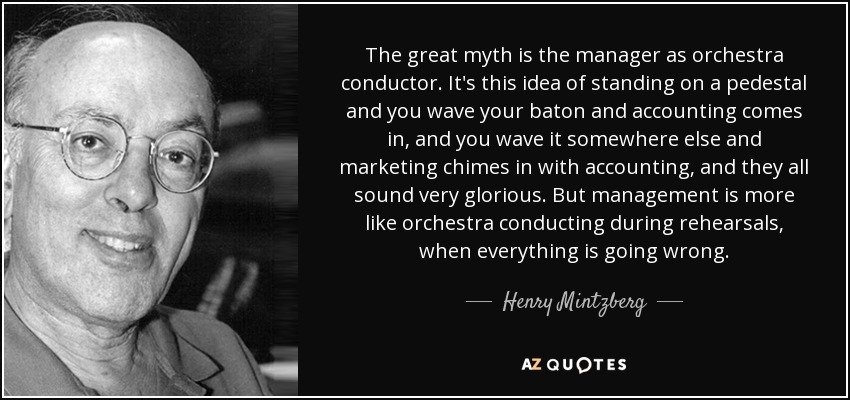 The great myth is the manager as orchestra conductor. It's this idea of standing on a pedestal and you wave your baton and accounting comes in, and you wave it somewhere else and marketing chimes in with accounting, and they all sound very glorious. But management is more like orchestra conducting during rehearsals, when everything is going wrong.