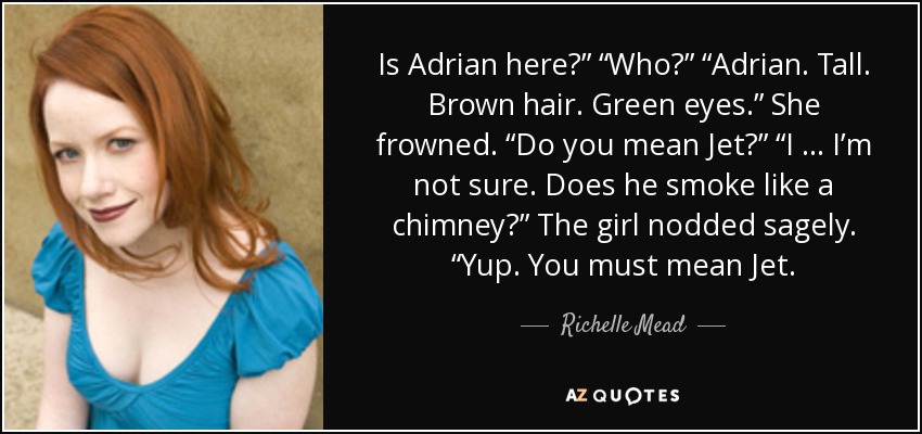 Is Adrian here?” “Who?” “Adrian. Tall. Brown hair. Green eyes.” She frowned. “Do you mean Jet?” “I … I’m not sure. Does he smoke like a chimney?” The girl nodded sagely. “Yup. You must mean Jet.