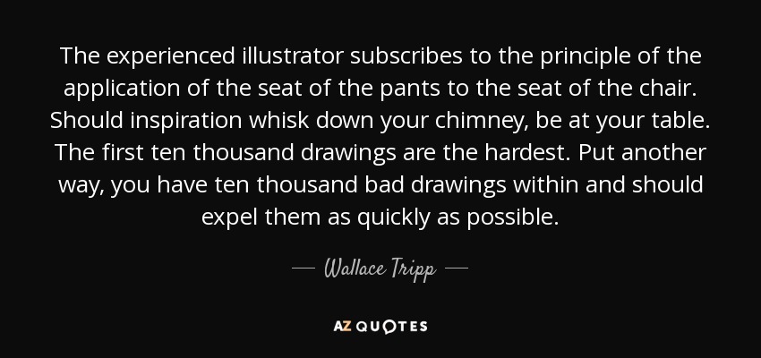 The experienced illustrator subscribes to the principle of the application of the seat of the pants to the seat of the chair. Should inspiration whisk down your chimney, be at your table. The first ten thousand drawings are the hardest. Put another way, you have ten thousand bad drawings within and should expel them as quickly as possible.