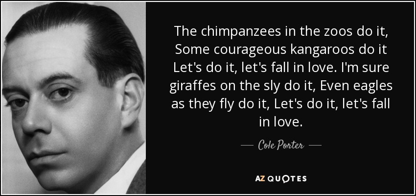 The chimpanzees in the zoos do it, Some courageous kangaroos do it Let's do it, let's fall in love. I'm sure giraffes on the sly do it, Even eagles as they fly do it, Let's do it, let's fall in love.