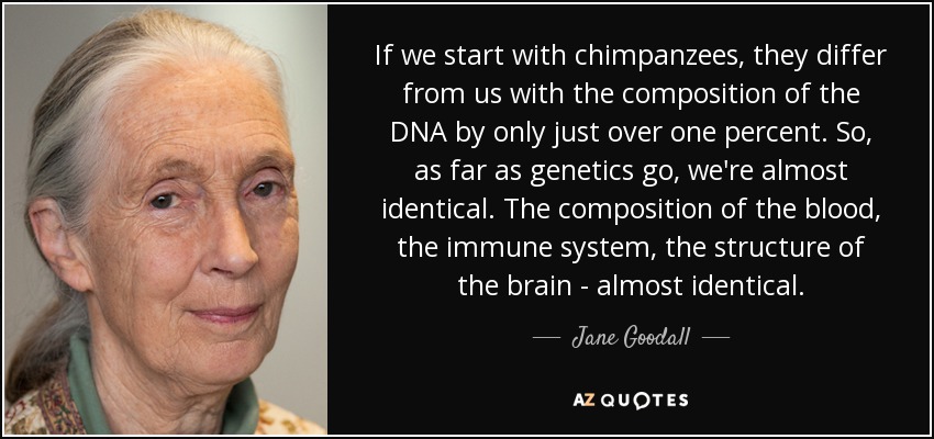If we start with chimpanzees, they differ from us with the composition of the DNA by only just over one percent. So, as far as genetics go, we're almost identical. The composition of the blood, the immune system, the structure of the brain - almost identical.