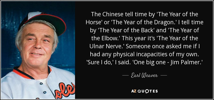 The Chinese tell time by 'The Year of the Horse' or 'The Year of the Dragon.' I tell time by 'The Year of the Back' and 'The Year of the Elbow.' This year it's 'The Year of the Ulnar Nerve.' Someone once asked me if I had any physical incapacities of my own. 'Sure I do,' I said. 'One big one - Jim Palmer.'