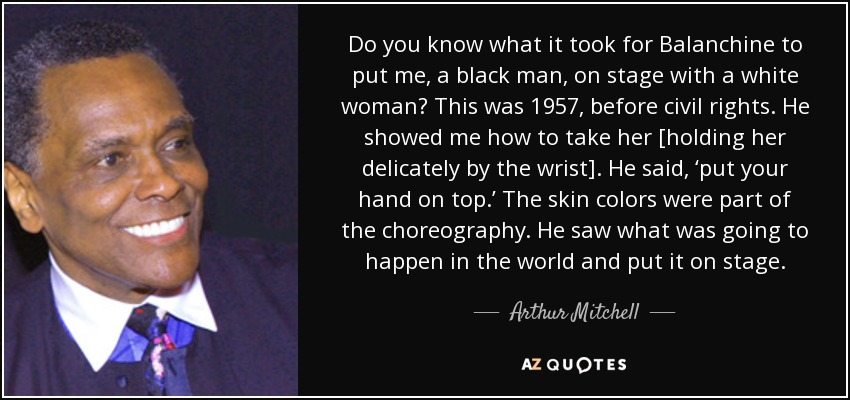 Do you know what it took for Balanchine to put me, a black man, on stage with a white woman? This was 1957, before civil rights. He showed me how to take her [holding her delicately by the wrist]. He said, ‘put your hand on top.’ The skin colors were part of the choreography. He saw what was going to happen in the world and put it on stage.