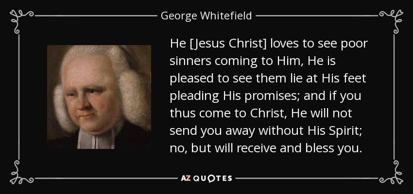 He [Jesus Christ] loves to see poor sinners coming to Him, He is pleased to see them lie at His feet pleading His promises; and if you thus come to Christ, He will not send you away without His Spirit; no, but will receive and bless you.