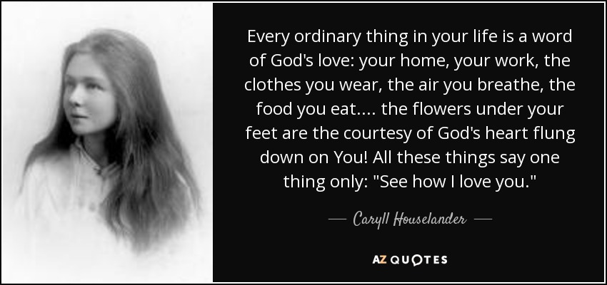 Every ordinary thing in your life is a word of God's love: your home, your work, the clothes you wear, the air you breathe, the food you eat.... the flowers under your feet are the courtesy of God's heart flung down on You! All these things say one thing only: "See how I love you."