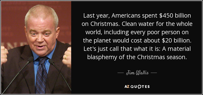 Last year, Americans spent $450 billion on Christmas. Clean water for the whole world, including every poor person on the planet would cost about $20 billion. Let's just call that what it is: A material blasphemy of the Christmas season.