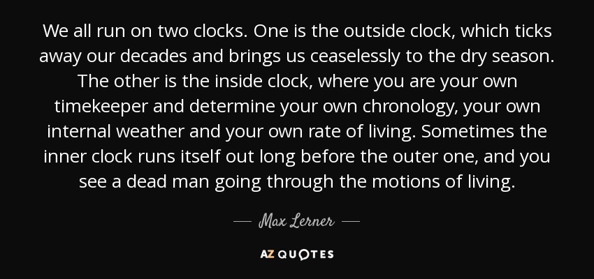 We all run on two clocks. One is the outside clock, which ticks away our decades and brings us ceaselessly to the dry season. The other is the inside clock, where you are your own timekeeper and determine your own chronology, your own internal weather and your own rate of living. Sometimes the inner clock runs itself out long before the outer one, and you see a dead man going through the motions of living.