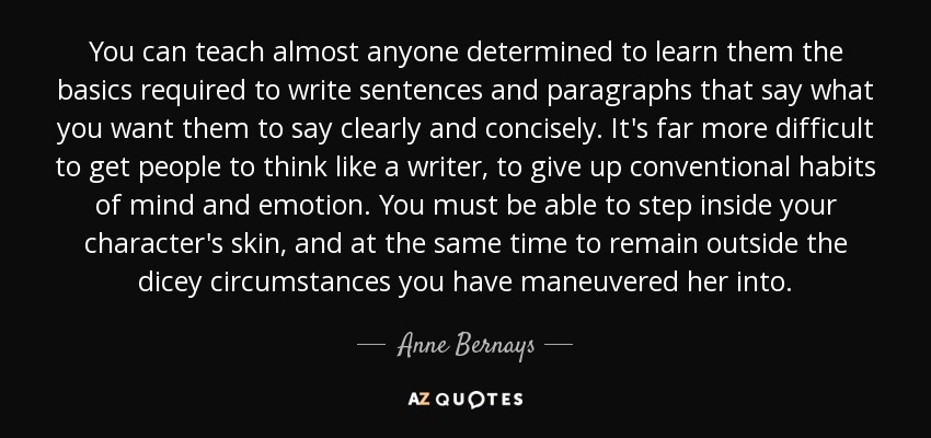 You can teach almost anyone determined to learn them the basics required to write sentences and paragraphs that say what you want them to say clearly and concisely. It's far more difficult to get people to think like a writer, to give up conventional habits of mind and emotion. You must be able to step inside your character's skin, and at the same time to remain outside the dicey circumstances you have maneuvered her into.