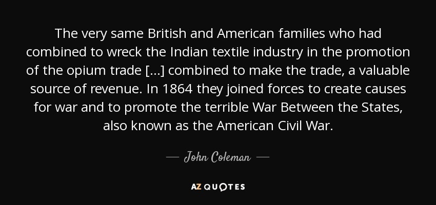 The very same British and American families who had combined to wreck the Indian textile industry in the promotion of the opium trade [...] combined to make the trade, a valuable source of revenue. In 1864 they joined forces to create causes for war and to promote the terrible War Between the States, also known as the American Civil War.