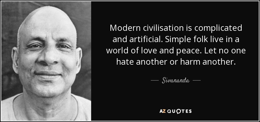 Modern civilisation is complicated and artificial. Simple folk live in a world of love and peace. Let no one hate another or harm another.