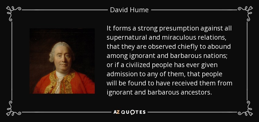 It forms a strong presumption against all supernatural and miraculous relations, that they are observed chiefly to abound among ignorant and barbarous nations; or if a civilized people has ever given admission to any of them, that people will be found to have received them from ignorant and barbarous ancestors.