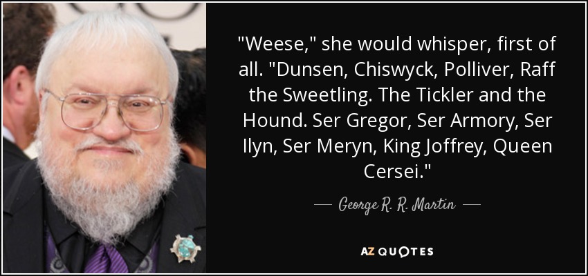 "Weese," she would whisper, first of all. "Dunsen, Chiswyck, Polliver, Raff the Sweetling. The Tickler and the Hound. Ser Gregor, Ser Armory, Ser Ilyn, Ser Meryn, King Joffrey, Queen Cersei."