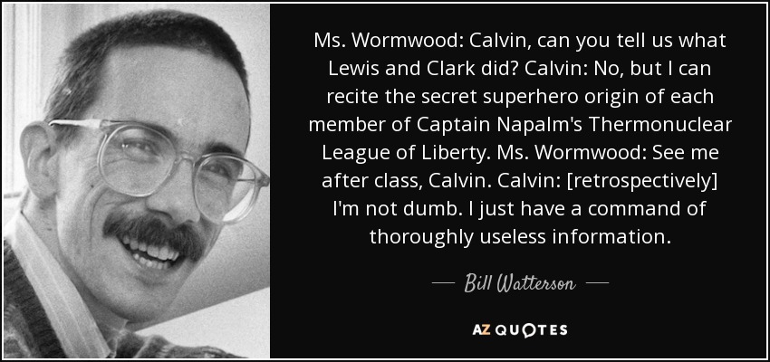 Ms. Wormwood: Calvin, can you tell us what Lewis and Clark did? Calvin: No, but I can recite the secret superhero origin of each member of Captain Napalm's Thermonuclear League of Liberty. Ms. Wormwood: See me after class, Calvin. Calvin: [retrospectively] I'm not dumb. I just have a command of thoroughly useless information.