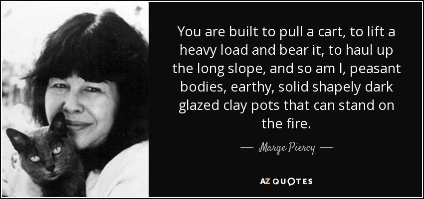 You are built to pull a cart, to lift a heavy load and bear it, to haul up the long slope, and so am I, peasant bodies, earthy, solid shapely dark glazed clay pots that can stand on the fire.