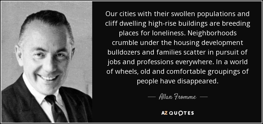Our cities with their swollen populations and cliff dwelling high-rise buildings are breeding places for loneliness. Neighborhoods crumble under the housing development bulldozers and families scatter in pursuit of jobs and professions everywhere. In a world of wheels, old and comfortable groupings of people have disappeared.