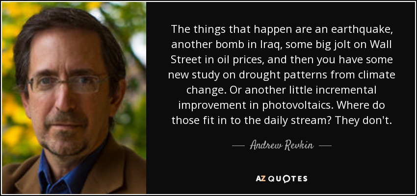 The things that happen are an earthquake, another bomb in Iraq, some big jolt on Wall Street in oil prices, and then you have some new study on drought patterns from climate change. Or another little incremental improvement in photovoltaics. Where do those fit in to the daily stream? They don't.