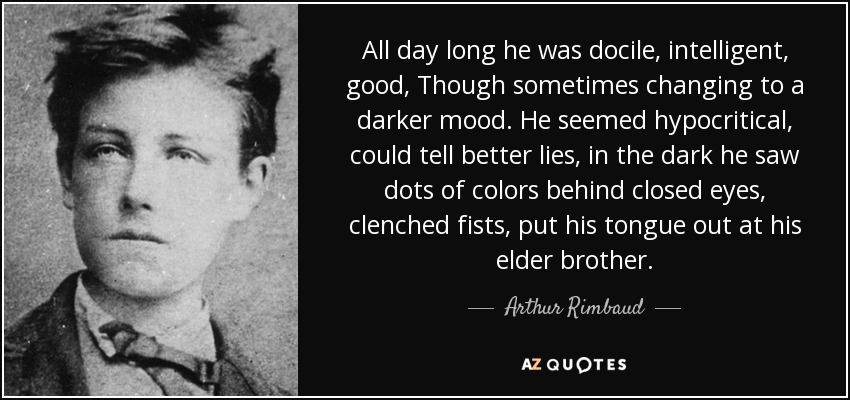 All day long he was docile, intelligent, good, Though sometimes changing to a darker mood. He seemed hypocritical, could tell better lies, in the dark he saw dots of colors behind closed eyes, clenched fists, put his tongue out at his elder brother.
