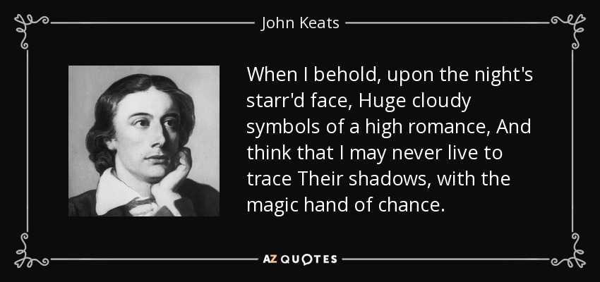 When I behold, upon the night's starr'd face, Huge cloudy symbols of a high romance, And think that I may never live to trace Their shadows, with the magic hand of chance.
