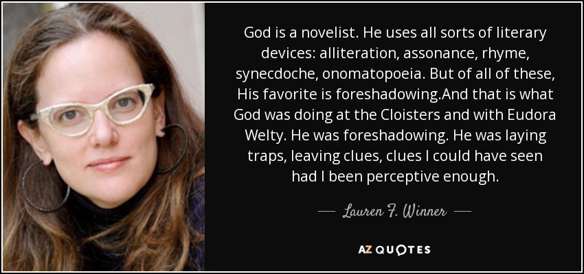 God is a novelist. He uses all sorts of literary devices: alliteration, assonance, rhyme, synecdoche, onomatopoeia. But of all of these, His favorite is foreshadowing.And that is what God was doing at the Cloisters and with Eudora Welty. He was foreshadowing. He was laying traps, leaving clues, clues I could have seen had I been perceptive enough.